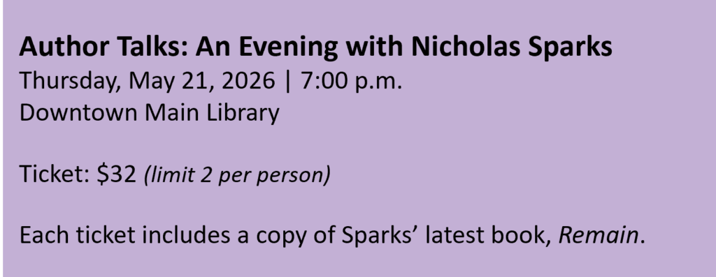 Known for stories that explore love, loss, and second chances, Nicholas Sparks has captivated millions of readers over the past three decades. This special event offers fans a rare opportunity to hear directly from one of the most widely read authors of our time—right here at the Library.